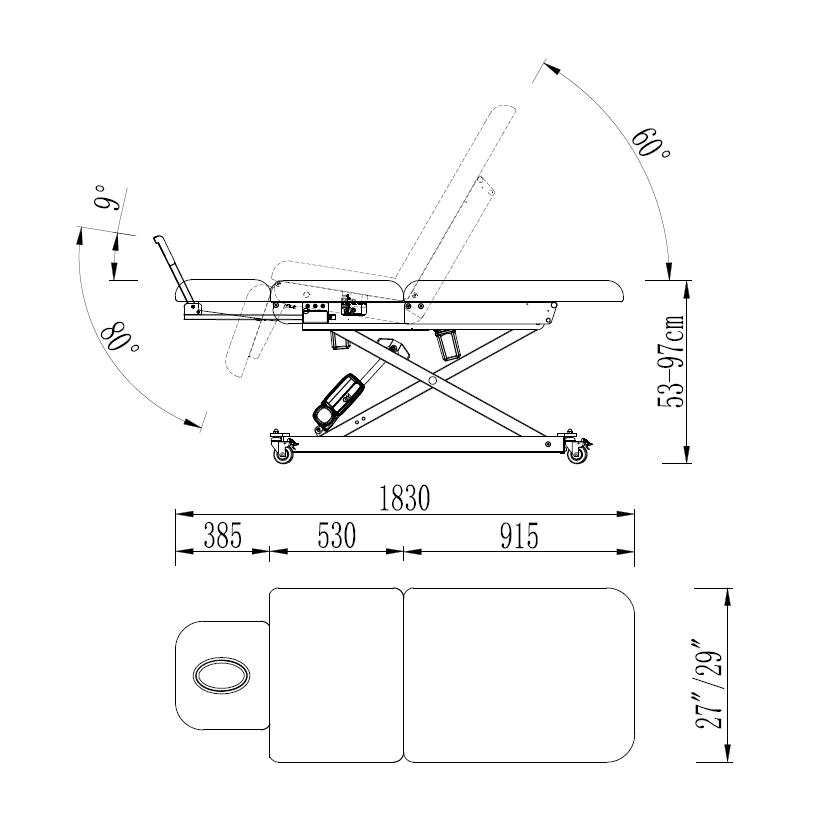 The electric motor power backrest ranges from flat to +60deg enabling a comfortable seated or semi – reclined postition